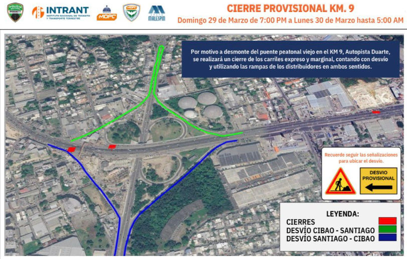 Santo Domingo, RD.— El Ministerio de Obras Públicas informó que este domingo en horario nocturno se realizará el retiro del viejo puente peatonal en el kilómetro 9 de la autopista Duarte, lo que implicará un cierre temporal de la vía y la aplicación de desvíos en la zona. Los trabajos iniciarán a las 7:00 de […]
